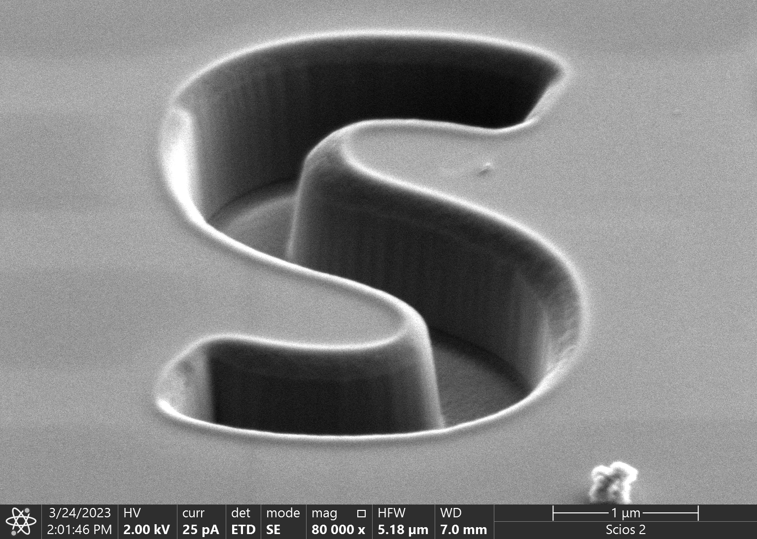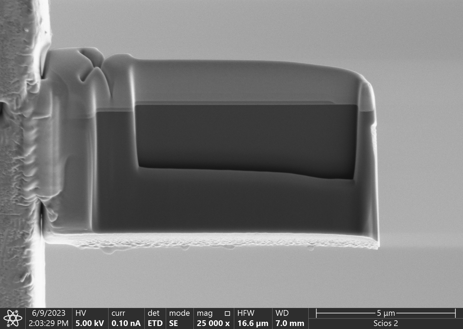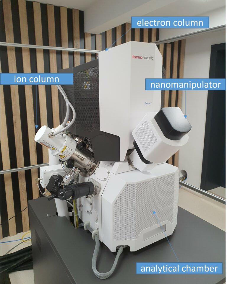 Thermo Scientific Scios 2 DualBeam je vysokorozlišovací skenovací elektrónový mikroskop(SEM), ktorý umožňuje pozorovanie vzoriek v skenovacom režime a nanoobrábanie vzoriek fokusovaným iónovým zväzkom (FIB). Mikroskop je vybavený niekoľkými detektormi pre komplexné pozorovanie a analýzu vzoriek v režimoch SEI, BEI a STEM ako aj pre elementárnu analýzu pomocou EDS detektora. Pri nevodivých vzorkách je možné dosiahnuť lepšie výsledky v režime nízkeho vákua. Mikroskop, vybavený fokusovaným iónovým zväzkom, nanomanipulátorom a GIS (Gas Injection System), slúži na prípravu vzoriek pre transmisnú elektrónovú mikroskopiu a ich povrchové opracovanie, čo rozširuje možnosti analýz komplexných materiálov.